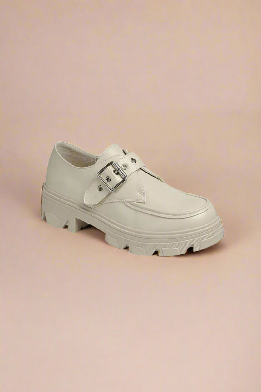 Buckled platform loafers combine contemporary style with practical comfort, crafted from high-quality vegan leather. Their bold platform and rugged lug sole deliver superior traction and stability, ideal for extended wear throughout your day. The distinctive buckle detail adds an elegant, eye-catching accent that enhances both casual and tailored looks. Perfectly suited to elevate denim or polished trousers alike, these loafers offer versatile sophistication for a variety of occasions. With low heels designed for ease and confidence, they seamlessly balance fashion-forward appeal with everyday functionality. A refined choice for those who value both style and substance.