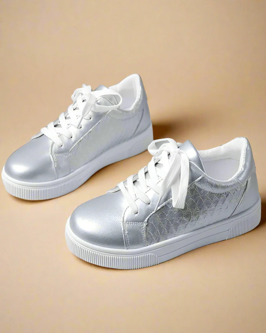 Experience timeless elegance with these Round Toe Lace Up Sneakers, crafted from durable vegan and patent leather for a polished look. Designed to fit true to size, they ensure effortless comfort with a flat heel perfect for all-day wear. The rubber sole adds reliable traction, making them ideal for both casual and refined ensembles. Please note, these sneakers do not include a box. With meticulous attention to detail and superior materials, they combine style and practicality seamlessly for the discerning wardrobe. Measurements and size conversions are available to guarantee the perfect fit.